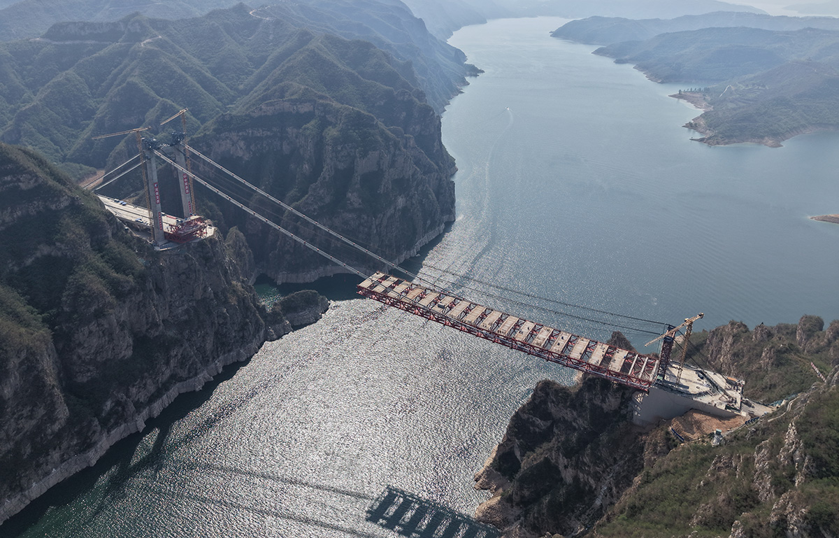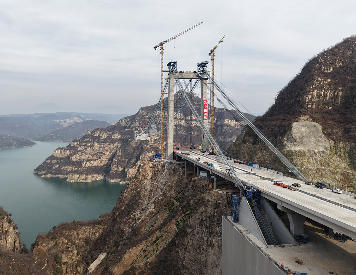該橋為主跨555米的獨塔單跨地錨式回轉(zhuǎn)纜懸索橋,全長1688.5米,采用2×145t纜索式起重機(jī)進(jìn)行安裝,2025年6月10日合龍。