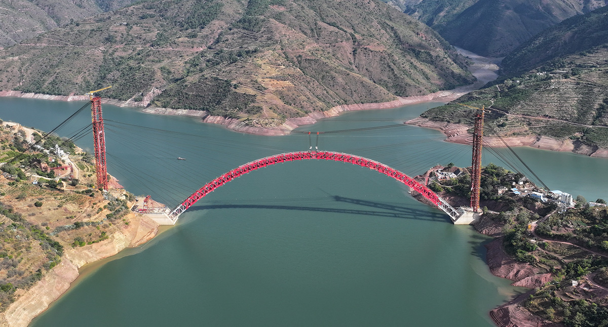 該橋?yàn)橹骺?90米的中承式鋼桁架提籃拱橋,全長546米,采用160t纜索起重機(jī)進(jìn)行安裝,2025年1月3日合龍。