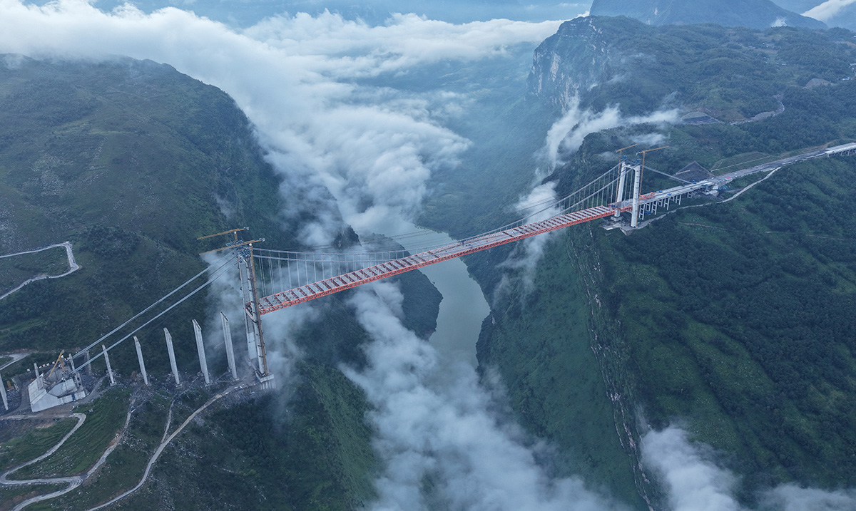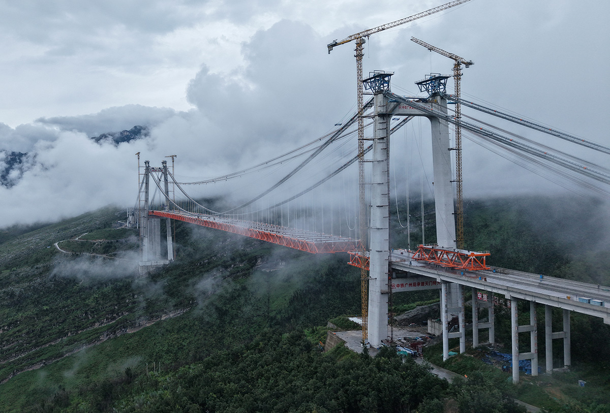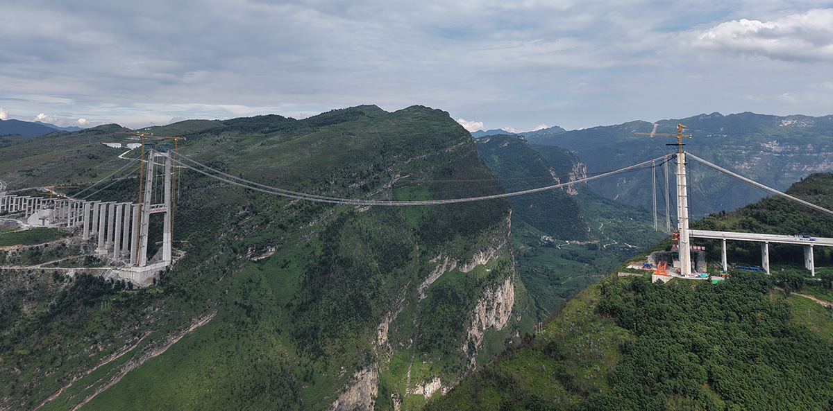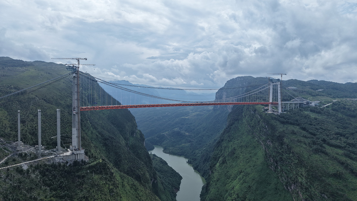 該橋?yàn)橹骺?20米的鋼桁梁懸索橋,全長(zhǎng)1553米,橋面至江面高度差達(dá)560米,是安盤高速公路全線控制性工程之一,采用260t纜索起重機(jī)進(jìn)行安裝,2025年9月23日合龍。